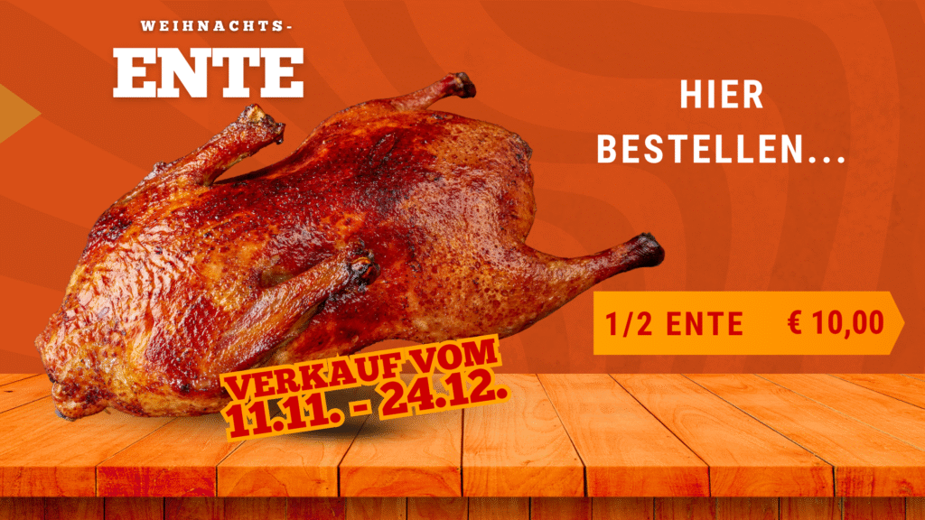 Möchtest Du eine gegrillte Ente aus unserem Sortiment vorbestellen, dann schreibe uns bitte, mit Abholung (Tag und Uhrzeit) und an welchem Standplatz. Bitte gib deine Bestellung mindesten 24 h im Voraus auf, damit wir dies einplanen können.